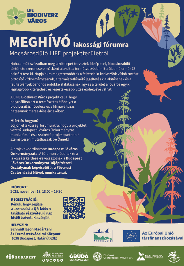 Mocsárosdűlő jövőjéről projektbemutató lakossági fórumot szervezünk a környező lakosság, szakmai és természetvédelmi szervezetek számára. A LIFE Biodiverz Város projekt beavatkozási elképzeléseit a Fővárosi Önkormányzat és a Fővárosi Csatornázási Művek munkatársai ismertetik. Várunk minden érdeklődőt november 18-án, 18 órakor kezdődő fórumunkra, a Schmidt Egon Madártani és Természetvédelmi Központba!
